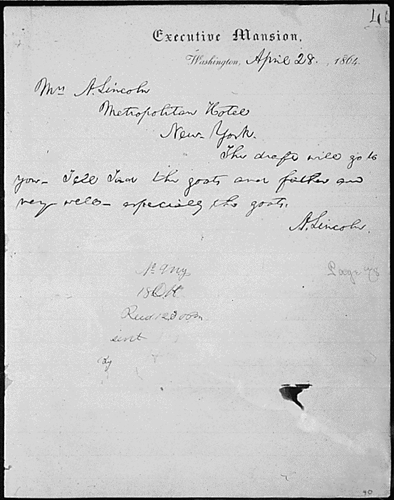Abraham Lincoln's telegram to his wife, Mary Todd Lincoln, sent April 28, 1864. It reads, "The draft will go to you. Tell Tad the goats and father are well—especially the goats. A.Lincoln" (35 words, 196 characters) Source: National Archives